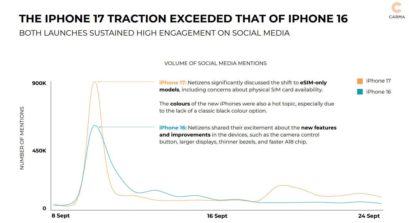 CARMA recently shared an analysis that tracked global social media conversations around the iPhone 17 launch across X, Reddit, YouTube, and HardwareZone between August and September 2025.