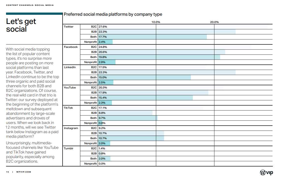 The report also reveals the social channels that are preferred for content marketing. Interestingly, Twitter is currently in the top spot, followed by Facebook, LinkedIn, Youtube, TikTok, Instagram, Tumblr, and others.