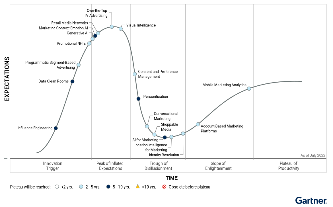 “Attention and investment dollars are also moving toward other emerging channels and technologies such as retail media networks, data clean rooms, promotional NFTs and over-the-top TV advertising, all nearing the Peak of Inflated Expectations (see Figure 1).”
