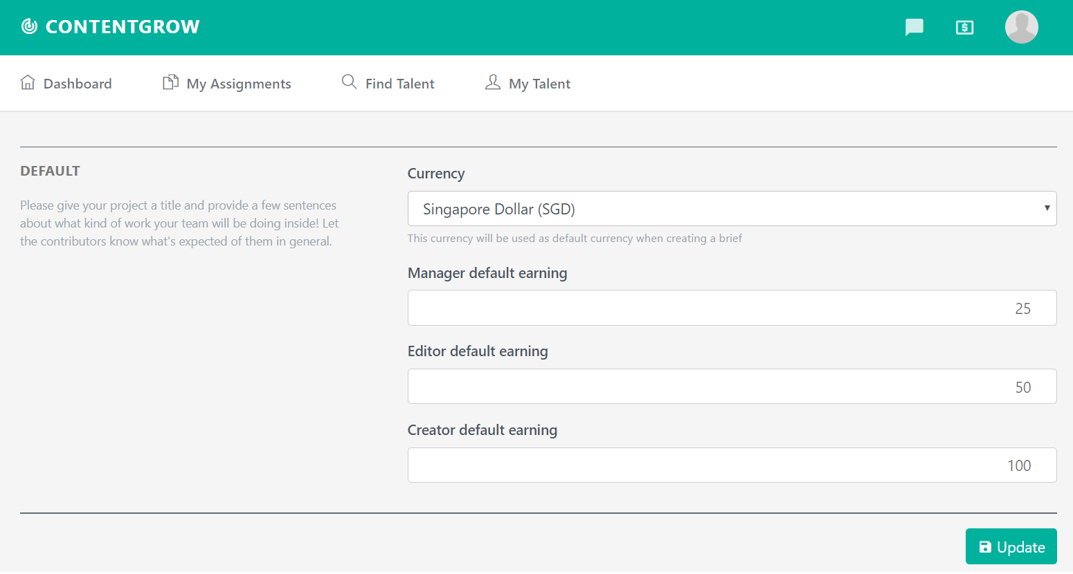 We added an option to set a default. This means publishers can now set fixed recurring rates within a project. The default currency and amounts you set here will auto-populate in every brief you make subsequently.
