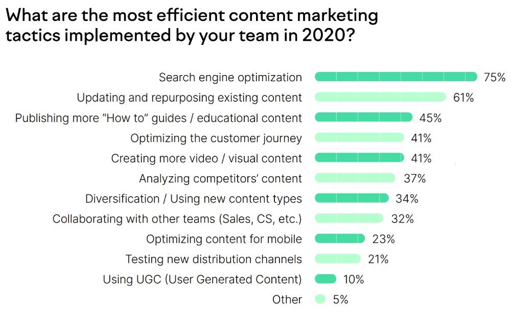SEO along with updating and repurposing existing content became the two most effective tactics deployed in 2020. Respondents also mentioned that harnessing the power of user-generated-content remains one of the most challenging strategies.